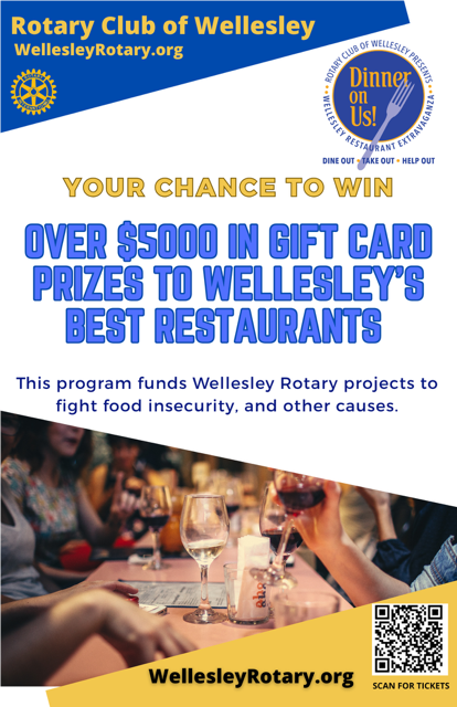 So many prizes, so little time! The Wellesley Rotary club has purchased gift cards from 50 Wellesley restaurants and many restaurants donated gift card prizes of $100, $50, and $25, so now it’s your turn to step up and win--Donate for chances to WIN BIG!!!